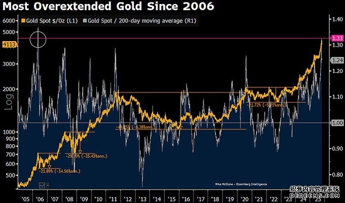 大宗商品价格行情黄金目前处于2006年以来最严重的过度扩张状态24K99讯 即使金价已飙升至近二十年来的最高程度,突出4,000美元/盎司,但彭博行业探讨(Bloomberg Intelligence)大宗商品战略师Mike McGlone以为,金价也许即将展示大幅回调。
