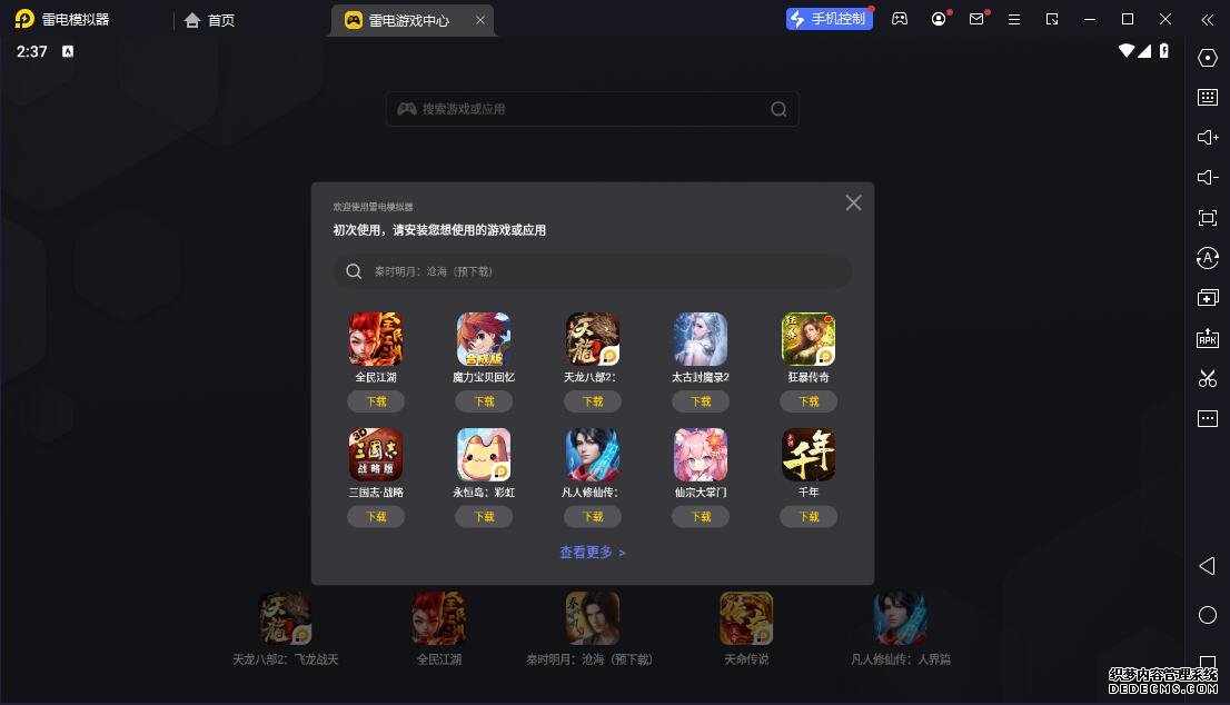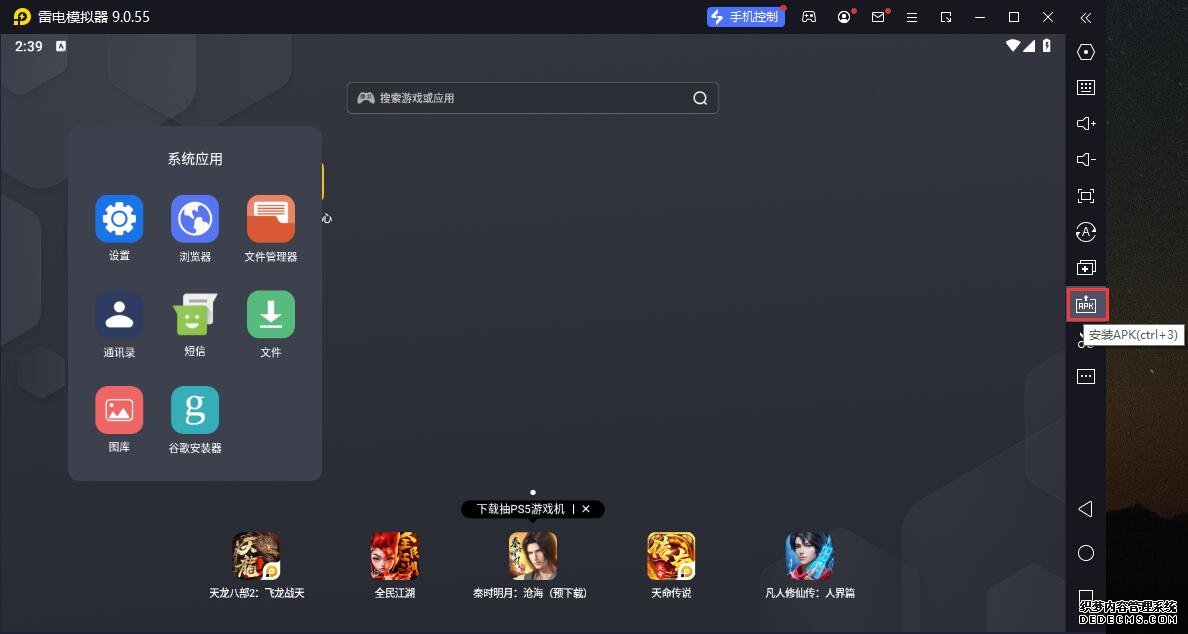 4、进入雷电模仿器主界面,点击右边栏APK图标采用“当地APK装置”按钮。