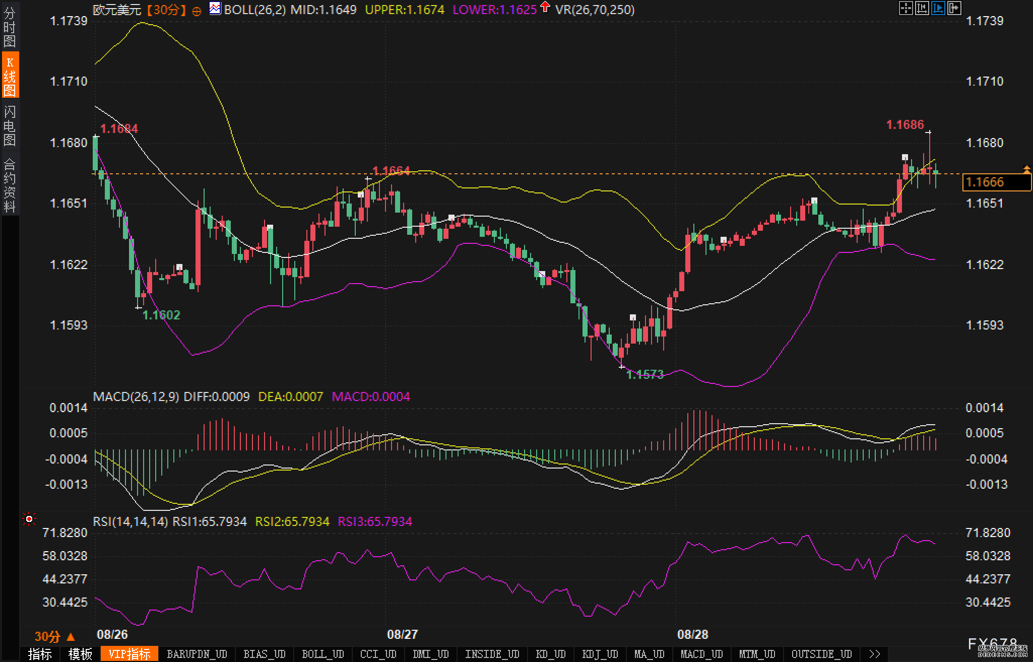 而今30分钟K线图配合布林带给出相对明晰的节律:布林中轨位于1.1649,上轨1.1674,下轨1.1625。欧元正在欧洲时段上攻至1.1686,短时“走带外”后敏捷回归上轨左近清理,显示众头动能充实但亦存正在赢利告终。只须汇价稳于中轨之上,布林带“上移—回测—再上移”的节律仍缔造。
