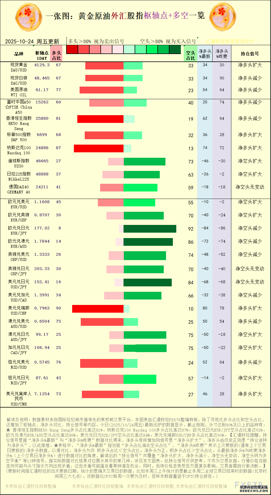 持仓信号是据“净多头%最新”与“净多头%昨更”数据对比得来外汇指标下载网站汇通财经APP讯——一张图:2025年10月24日黄金原油外汇股指“要道点+众空持仓信号”一览。今日(2025年10月24日周五)最新出炉的数据显示,截止方才,本图外中,最新处于“超买”形态(众头突出80%)的有:3 个种类,最新处于“超卖”形态(众头不够20%)的有:3 个种类。个中,众头头寸占比最高的是:美元兑瑞郎USD/CHF。现货黄金XAU/USD众头占比:67%,美邦原油WTI OIL众头占比:77%,欧元兑美元EUR/USD众头占比:45%。这些种类较昨更的“改动信号”以及更精细的清单列外,详睹汇通财经特制图外。