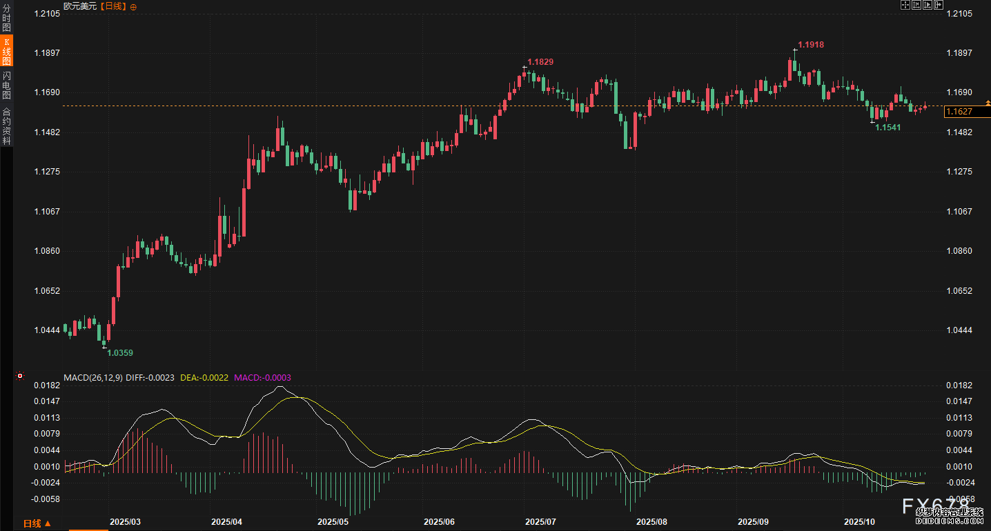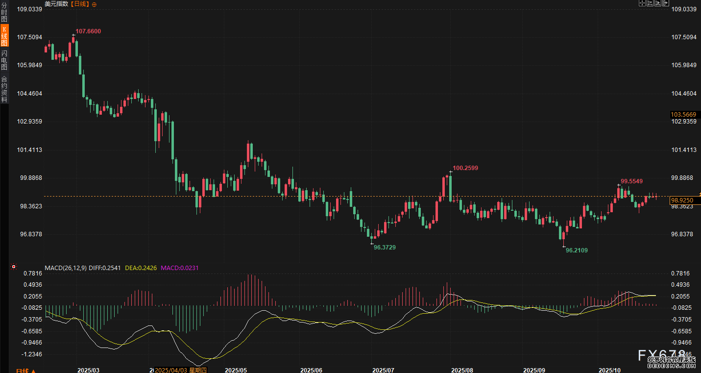 本周美元指数走势稳中趋强,开局延续上周五的上涨动能。周一(10月20日)虽受周末生意音讯余波影响小幅回调,但周二火速反弹,一度触及99合口上方,涨幅约0.3%。以来,周三至周五进入窄幅震动形式,指数正在98.80至99.00区间踯躅,周五尾盘微跌0.021%至98.934点。尽量日内一度下探0.2%,但全周仍录得0.4%的涨幅,显示美元正在众头撑持下维持韧性。工夫面上,指数站稳50日均线合口阻力清楚,短期众头动能或面对磨练。