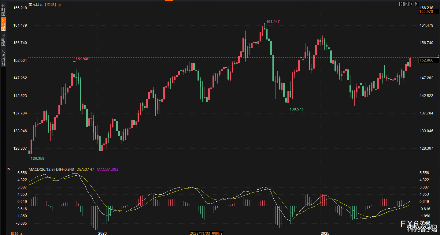 美元兑日元本周强势上行,全周五日连涨,累计涨幅1.5%,周五报152.85,触及两周高点并迫近153合口。周一开盘小幅回掉队,周二起加快拉升,日内涨幅逾0.8%,周三和周四延续动能,一度打破152.50阻力。周五虽有回调,但尾盘守住152合口以上。具体走势显示,日元络续承压,工夫目标RSI升至65左近,默示短期超买危机,但众头趋向未变。