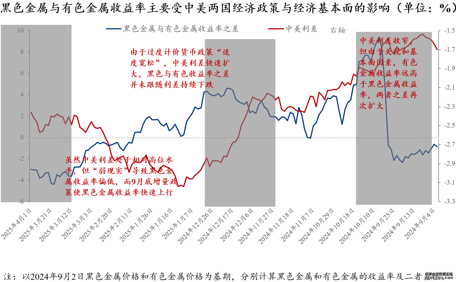 于是,能够意念的是,他日正在商业冲突加剧的后台下,若邦内无强有力的增量战略(好似2024年9月底),或者有用的供应端财富战略,纵使中美利差收窄,玄色金属收益率也会低于有色金属收益率,二者之差大概还会扩充。