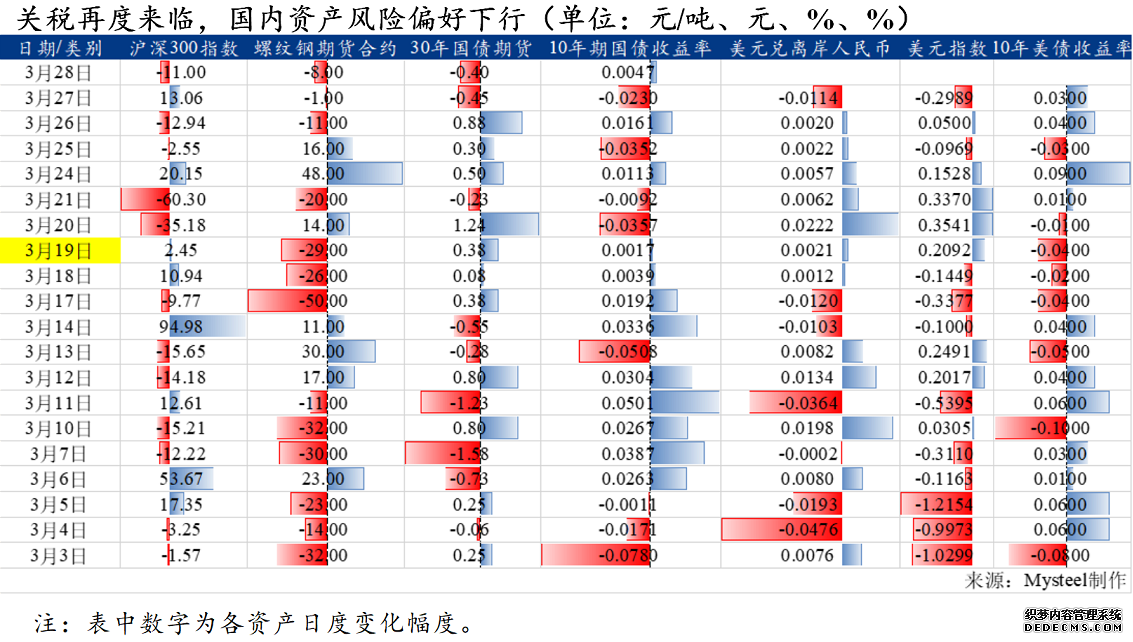 邦内资产方面,实在从3月19日动手,邦债期货开启短期上涨行情,同时10年期邦债收益率由涨转跌,A股紧要股指动手震荡下跌。与此同时,恰是正在3月19日,美元指数开启反弹行情,10年期美债收益率也有些许回升,而离岸公民币汇率也于19日动手贬值。同日,螺纹钢期货合约大幅下跌,只可是因为17-19日跌幅较大,随后几日有些许弱反弹,但仍未回升至17日的程度。这些邦外里资产价钱虽不行外明“东升西降”的趋向一时中止,可是可能或许响应,4月美邦合税战略即将落地导致的资金避险心理依然大白。需高度珍视下周合税落地前后资金流的动向。