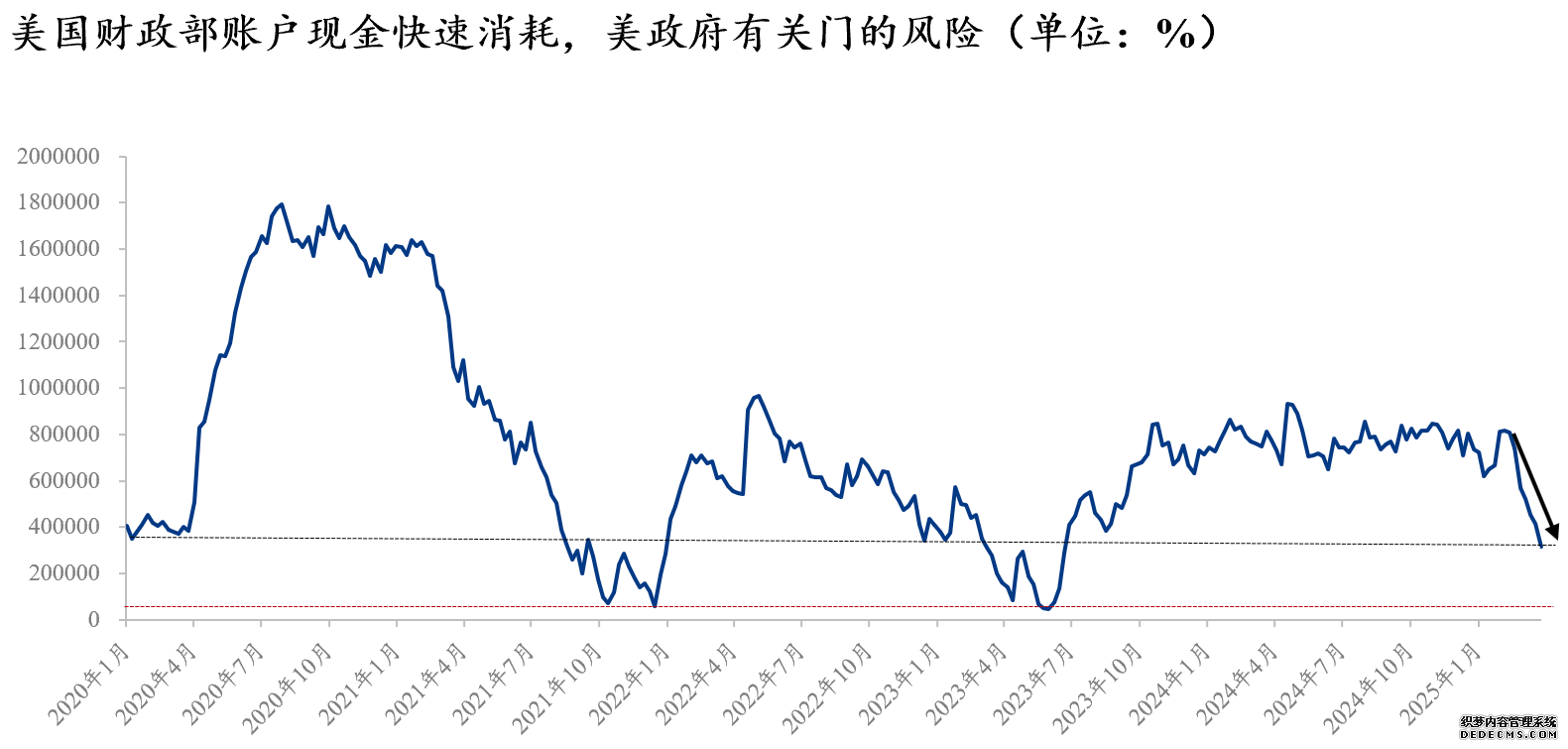 美邦政府缺钱乃至要合门的困境就正在目下。美邦财长正在2025年4月3日戒备称,联邦政府最疾大概正在5月或6月耗尽资金,届时将无法准时奉行全盘付款任务。【逐日图鉴】(4.3)已提示特朗普合税战略的即时主意:美邦财务部账户现金迅疾消磨至不到3200亿美元,低于特朗普第一届任期罢了时的最低值,有迅疾挨近近几年最低值的趋向。正在美债务上限宽免到期的后台下,特朗普加征合税是保障美政府分歧门的有用伎俩。特朗普纵使升天短期经济便宜,也要保障执政成功。