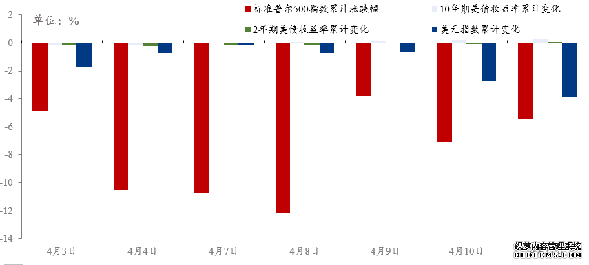 咱们统计了北京岁月4月3日至4月7日下昼三点,环球紧要大类资产的价钱涨跌幅。能够发掘以下几点:(1)环球危机资产下跌,无一幸免;且美邦相干资产,或者说美邦订价权更大的资产价钱跌幅更大,譬喻标普500、LME铜和原油(暂不思索供应端身分)。正在中方强力反制后,美股跌幅更甚。(2)反过来,环球危机资产涌现稍好,卓殊是美债涌现最好;这对应着美债收益率连接下跌。(3)铜油跌幅均较大,但原油跌幅更大。(4)黄金固然属于避险资产,但仍难遁下跌。(5)公民币汇率有贬值压力,但贬值幅度一时不大。(6)美元指数并未如预期地强势上行,而是下跌。