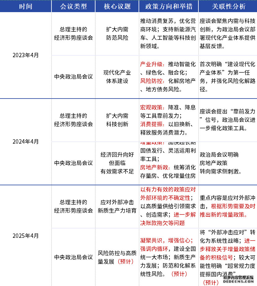 正在合税冲锋的影响慢慢大白的后台下,4月9日下昼李强总理主办召开经济地势专家和企业家会叙会。聚会赐与了市集激烈的踊跃信号。本期【逐日图鉴】陈列了近三年会叙会的中心实质,并预测了大概于本月召开的焦点政事局聚会实质:进一步开释合于增量战略贮藏的踊跃信号;正在3月16日出台的《提振消费专项活动计划》的本原上,较大大概性地了了“超惯例力度提振邦内消费”等。