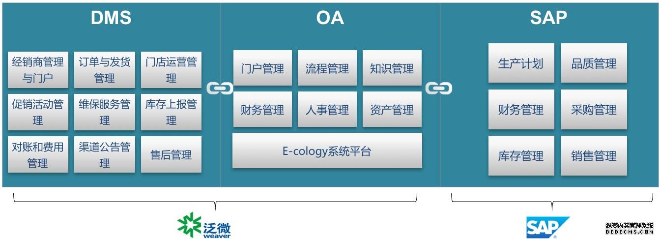 泛微通过流程引擎、家数引擎、集成引擎、修模引擎把 ERP、DMS 等营业主旨体系与 OA 对接,为企业构修一体化的营业处分体系。