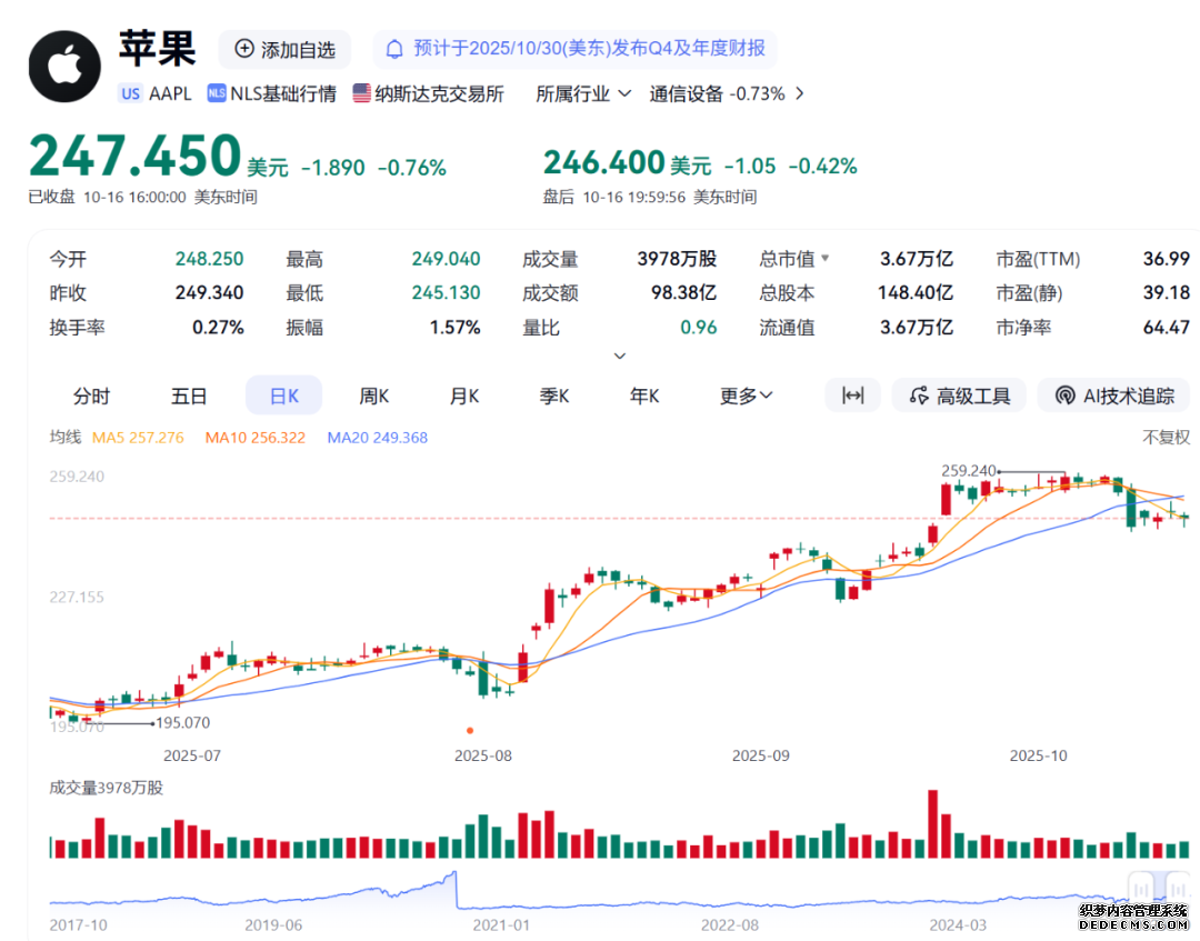 每经小编(微信号:nbdnews)属意到,iPhone 17系列和iPhone Air公布后苹果股价一齐上涨,但是迩来几个往还日苹果股价颠簸下挫,目前每股报247.25美元,总市值3.67万亿美元。
