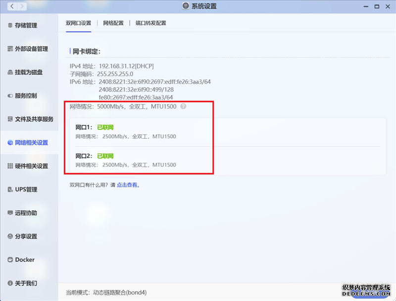 2个网口可能援救4种聚拢形式,咱们遴选了“动态链能聚拢”,筑立已毕之后,联贯速度直接酿成了5000Mbps。