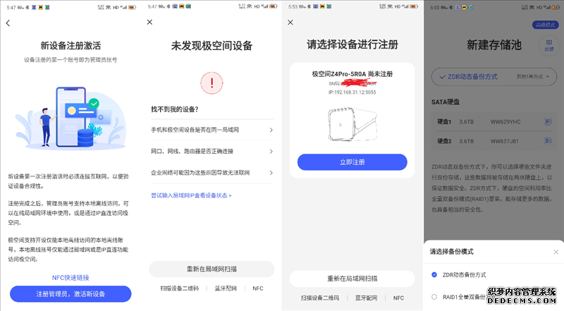 第一次应用极空间时,须要筑立硬盘的运转形式。极空间援救3种RAID形式,ZDR动态双备份形式、RAID1全量双备份形式以及RAID5。