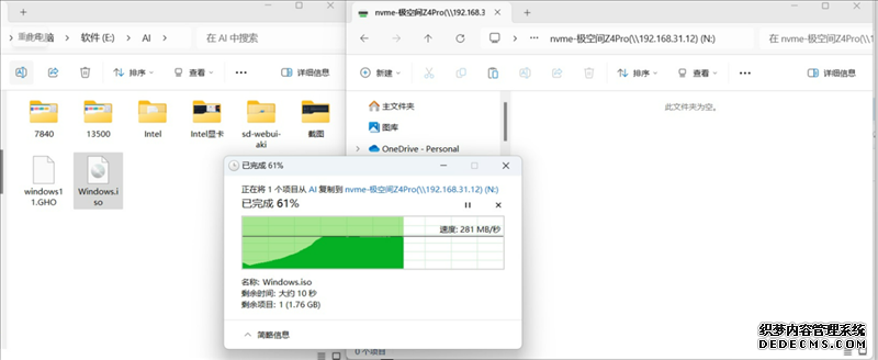 咱们测试了一下速率,将当地硬盘的文献拷贝入NAS(N盘),可能到达280MB/s的速率。这要紧是由于我的主机唯有一个2.5Gbps网口,假设你有万兆网口,外面上NAS拷贝速率是可能翻倍到560MB/s的。