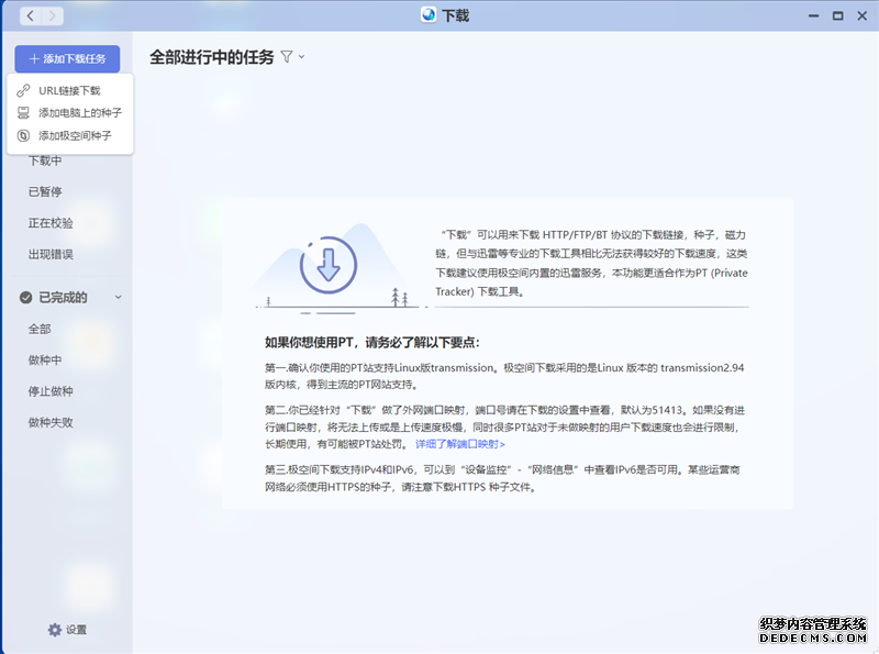 极空间的内置的下载器材,内部采用了Transmission 2.94 版本的内核,主流的PT网站都能援救,这意味着,它是一个挂PT的利器。