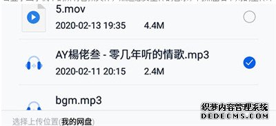 3、软件会显示入手机中的全盘音频文献,点选念要上传的音乐,再点击上传即可。