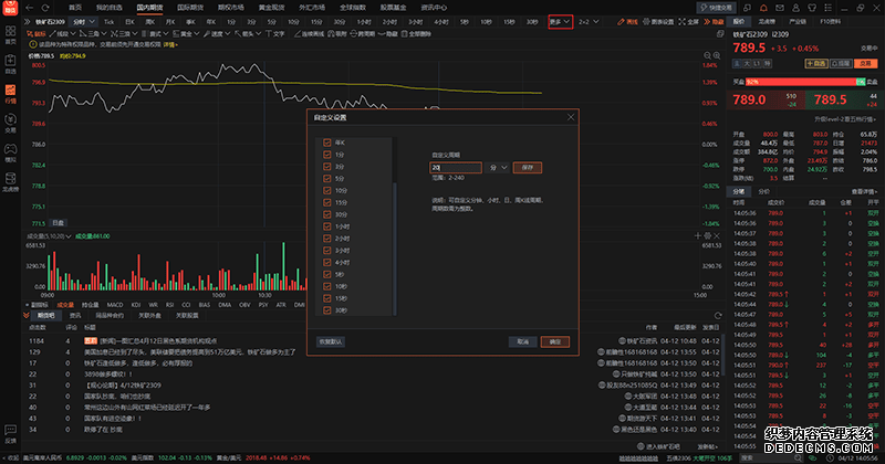 PC端新增自界说周期成效,助助对邦内期货周期举办自界说修立。您可正在期货详情页的周期选项中单击“更众”,鄙人拉列外中点击“自界说”按钮进入自界说周期修立弹窗修立您必要的K线周期。