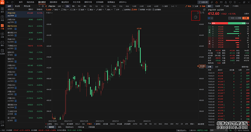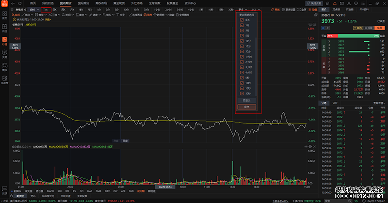 邦内期货新增tick行情和秒级K线行情。您可正在期货详情页的周期选项中点击“tick”按钮查看tick行情,点击“更众”按钮采用和查看5秒、10秒、15秒、30秒K线行情。