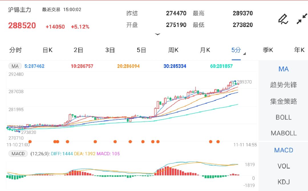 11月11日期货软件走势图综述:沪锡期货主力涨512%金投网APP行情中央数据显示,截止2021年11月11日下昼15:00收盘,沪锡期货主力合约行情讯息:最新价:288520,涨跌:14050,涨跌幅:5.12%,成交量:80563手,开盘价:275190,昨收价:275690,最高价:289370,最低价:273820。