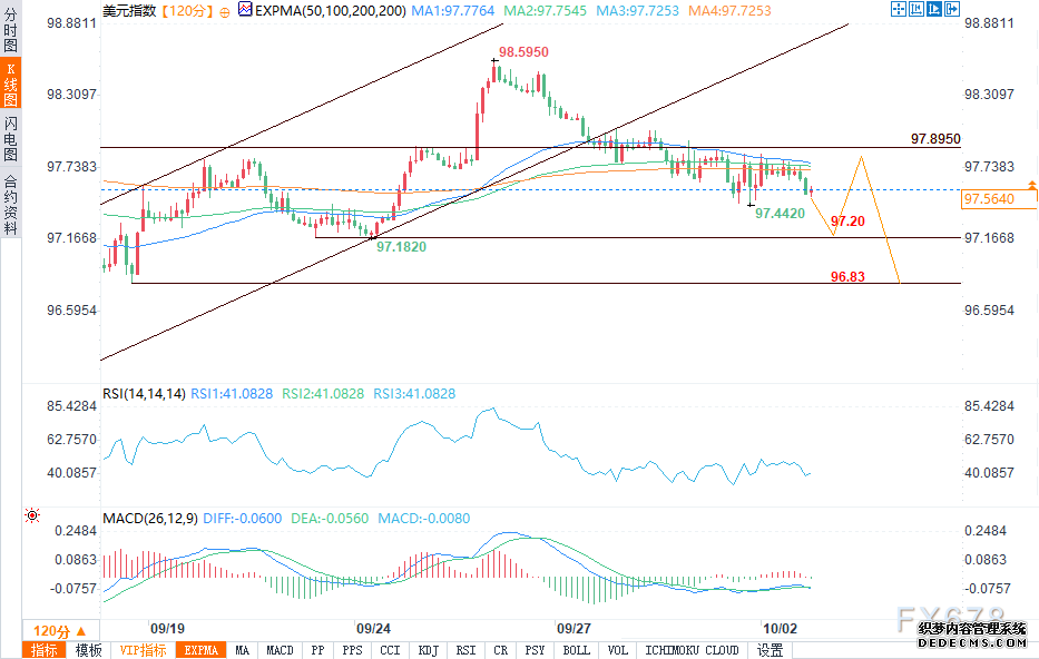 若美元指数未能收复97.89的阻力位,也许会向下测试97.20,进一步撑持位正在96.83和96.23。