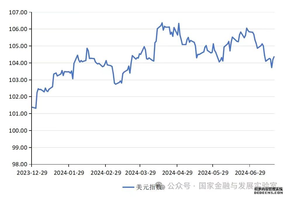 2024年上半年,美元指数正在高位盘整,总体正在101-106的区间内摇动。2023年12月29日至2024年7月19日,美元指数从101.38上升至104.37,升值2.95%(睹图2)。笔者正在《2023年年度邦民币汇率申诉》2中指出三大不确定性成分将影响美元指数2024年走势:一是美联储退出量化紧缩的年光节点和退出途径;二是地缘政事危害是否会再度升级;三是特朗普从新胜选美邦总统带来的潜正在影响。笔者正在《2024年第一季度邦民币汇率申诉》3中估计,若上述三大不确定性正在2024年第二季度继续升级,美元指数正在2024年将维持高位盘整,估计正在100-110区间内运转。2024年上半年,美元指数走势情景总体适应笔者预期。