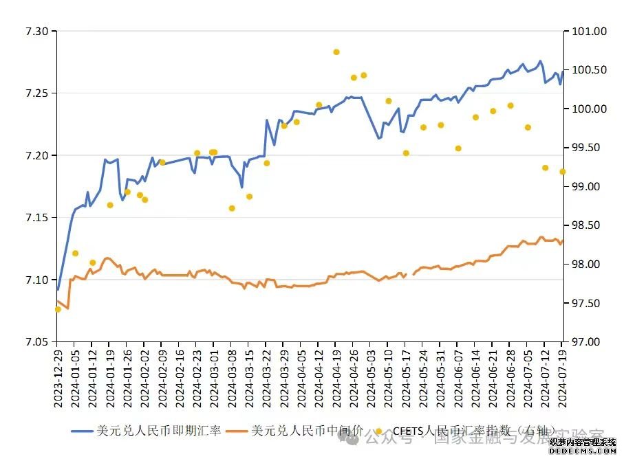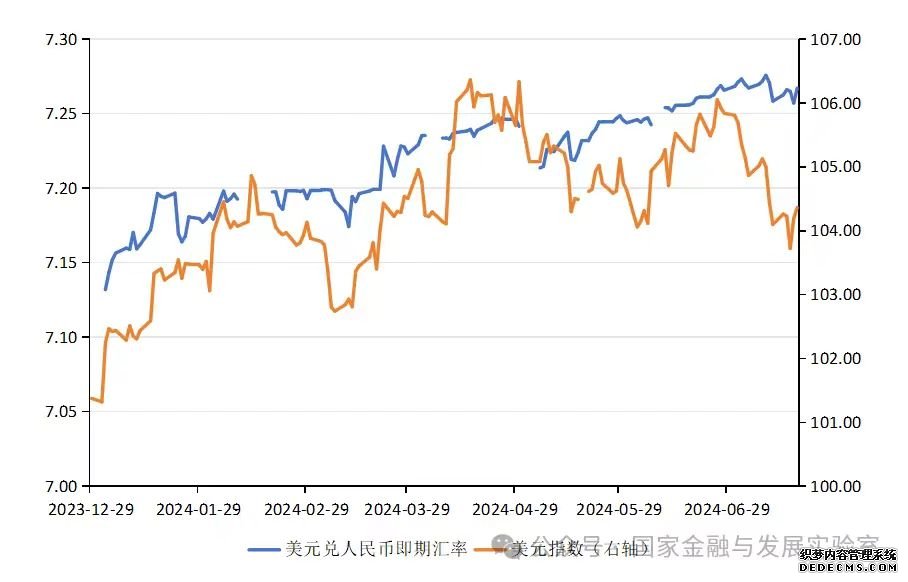 2023年12月29日至2024年7月19日,美元指数由101.38上升至104.37,升值了2.95%(睹图6)。同期内,邦民币兑美元即期汇率与美元指数两者的走势具有较强的联系性,诠释美元有用汇率蜕变对邦民币兑美元汇率蜕变的影响较大。