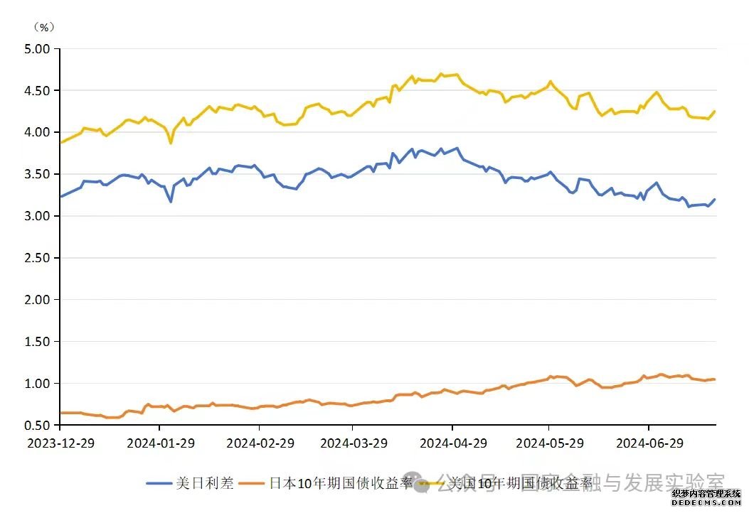 美邦和日本因钱银策略分化而导致的美日利差继续拉大是日元贬值的首要由来。2023年12月29日至2024年7月19日,美日利差正在3.1%至3.8%的区间内摇动。2024年上半年,美日利差合座浮现两阶段走势。第一阶段为2023年12月29日至2024年4月30日,美日利差从3.233%上升至3.811%。第二阶段为2024年4月30日至2024年7月19日,美日利差从3.811%低浸至3.197%。该阶段,美日利差低浸由来有二:一方面正在于美邦10年期邦债收益率有所低浸;另一方面正在于跟着日本央行于2024年3月正式退出负利率策略,松手收益率弧线节制(YCC)策略,日本10年期邦债收益率正在该阶段继续上行所致(睹图4)。总体而言,固然美日利差正在2024年二季度有所低浸,但美日利差仍处于高位。