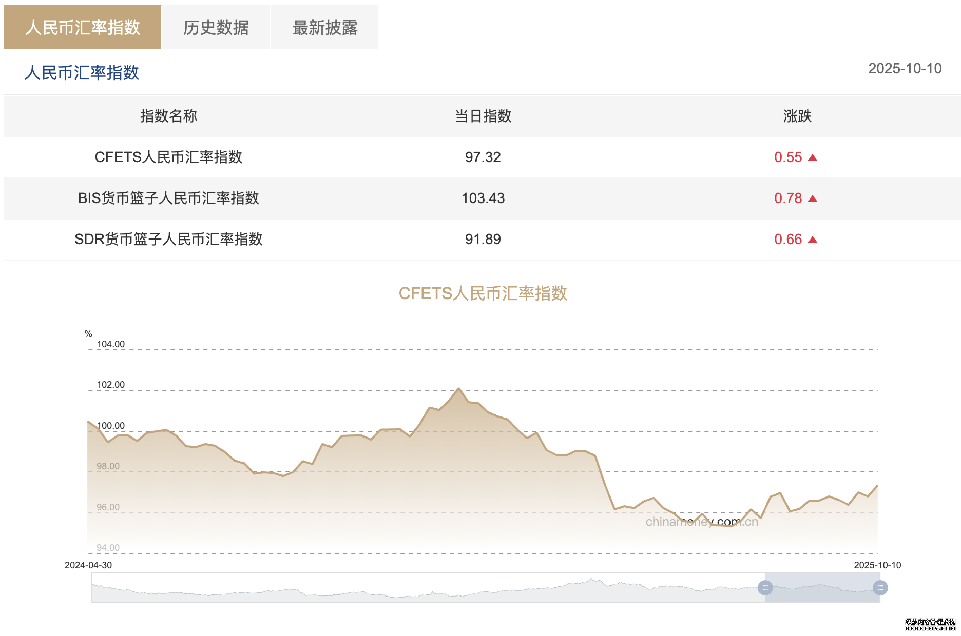 除了百姓币兑美元汇率,百姓币对一篮子货泉近期也小幅走高。中外洋汇来往中央布告数据最新显示,10月10日当周三大百姓币汇率指数全线上涨,CFETS百姓币汇率指数报97.32,按周涨0.55,创2025年4月此后新高;BIS货泉篮子百姓币汇率指数报103.43,按周涨0.78,创2025年4月此后新高;SDR货泉篮子百姓币汇率指数报91.89,按周涨0.66,创2025年4月此后新高。