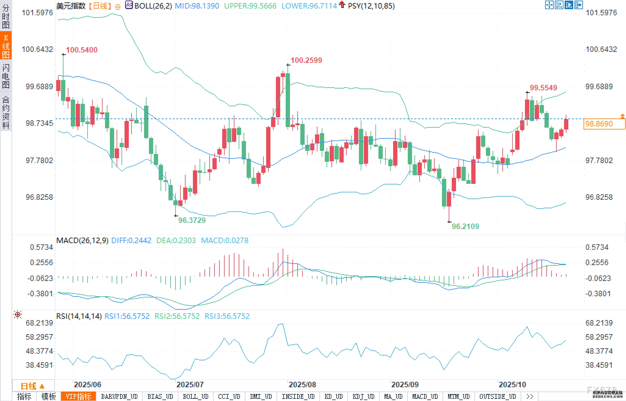 日线图显示美元指数处于布林带内温和上行的节律。实体K线之上,注明短线众头趋向尚未伤害;布林上轨99.5666与近端波峰99.5549简直重合,组成第一重“动能—价钱”共振阻力,一朝有用上破,价钱将直眼前高100.2599的真空区间。下行方面,布林下轨96.7114与前低96.2109组成区间化“最终防地)this.width=500 align=center hspace=10 vspace=10 rel=nofollow/目标层面,MACD(26,12,9)的DIFF 0.2442、DEA 0.2303均正在零轴上方,但柱状图0.0278显示上手脚能发端钝化,警示短线“量能不够的高位震撼”;RSI(14)正在56.5752左近,处于温和偏众区间但未进入超买。归纳鉴定:98.1390是此刻趋向众空分水岭,上方99.5549/99.5666组成鳞集阻力带;若回撤不破中轨,仍属“顺势摒挡”;若跌破中轨,则指向96.7114—96.2109区间的回测。价钱组织尚未显示规范的“头肩顶/三重顶”样子,此刻更亲切“箱体上沿再三试压”的态势,箱体大致落正在96.50—100。