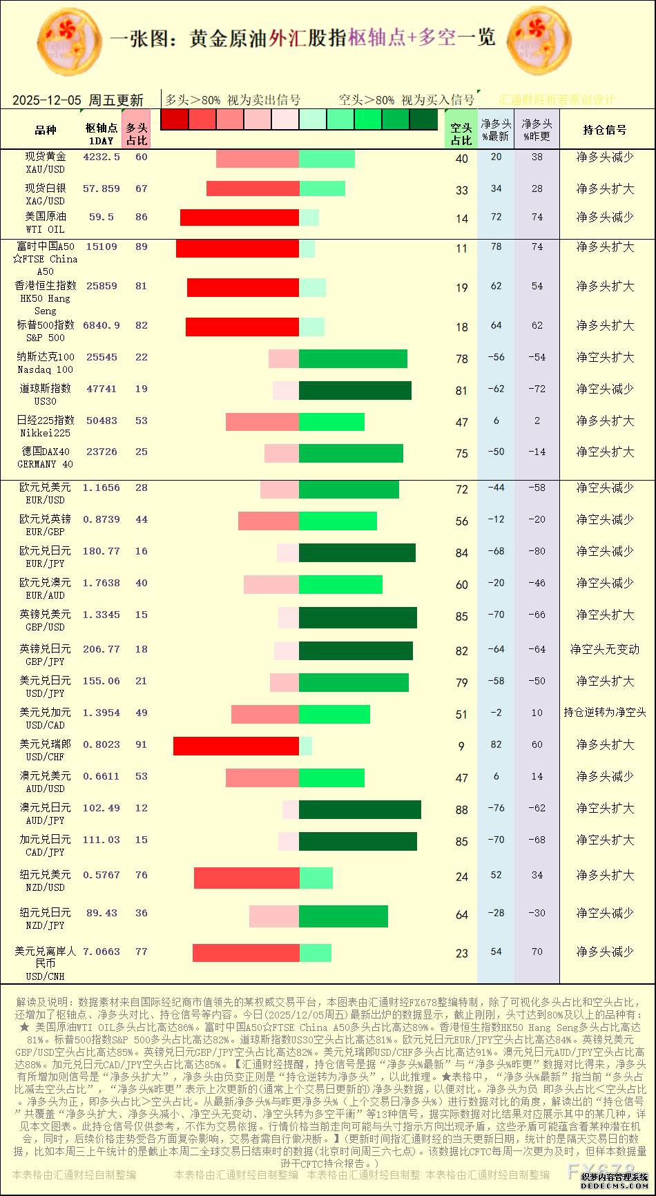 净多头为负 即多头占比<空头占比2025年12月7日汇通财经APP讯——一张图:2025年12月5日黄金原油外汇股指“要道点+众空持仓信号”一览。今日(2025年12月5日周五)最新出炉的数据显示,截止刚才,本图外中,最新处于“超买”形态(众头越过80%)的有:5 个种类,最新处于“超卖”形态(众头亏折20%)的有:6 个种类。此中,众头头寸占比最高的是:美元兑瑞郎 USD/CHF。现货黄金XAU/USD众头占比:60%,美邦原油WTI OIL众头占比:86%,欧元兑美元EUR/USD众头占比:28%。这些种类较昨更的“改动信号”以及更周密的清单列外,详睹汇通财经特制图外。