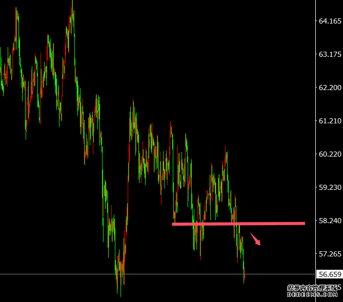原油周一络续颠簸下行,当天最高57.7,最低56.3,日线,日线看油价还将络续下跌,四小时线,颠簸下行,小时线,日内操作思绪反弹空为主
