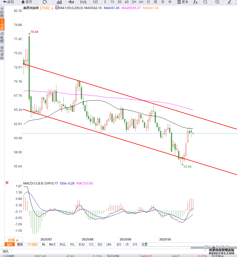 从工夫面看,WTI原油日线图浮现短线美元/桶相近存正在明白撑持位,而上方阻力位集合正在62.50美元区域。若油价接续受压于该区间,短线美元撑持程度。