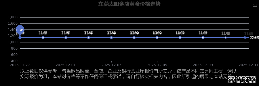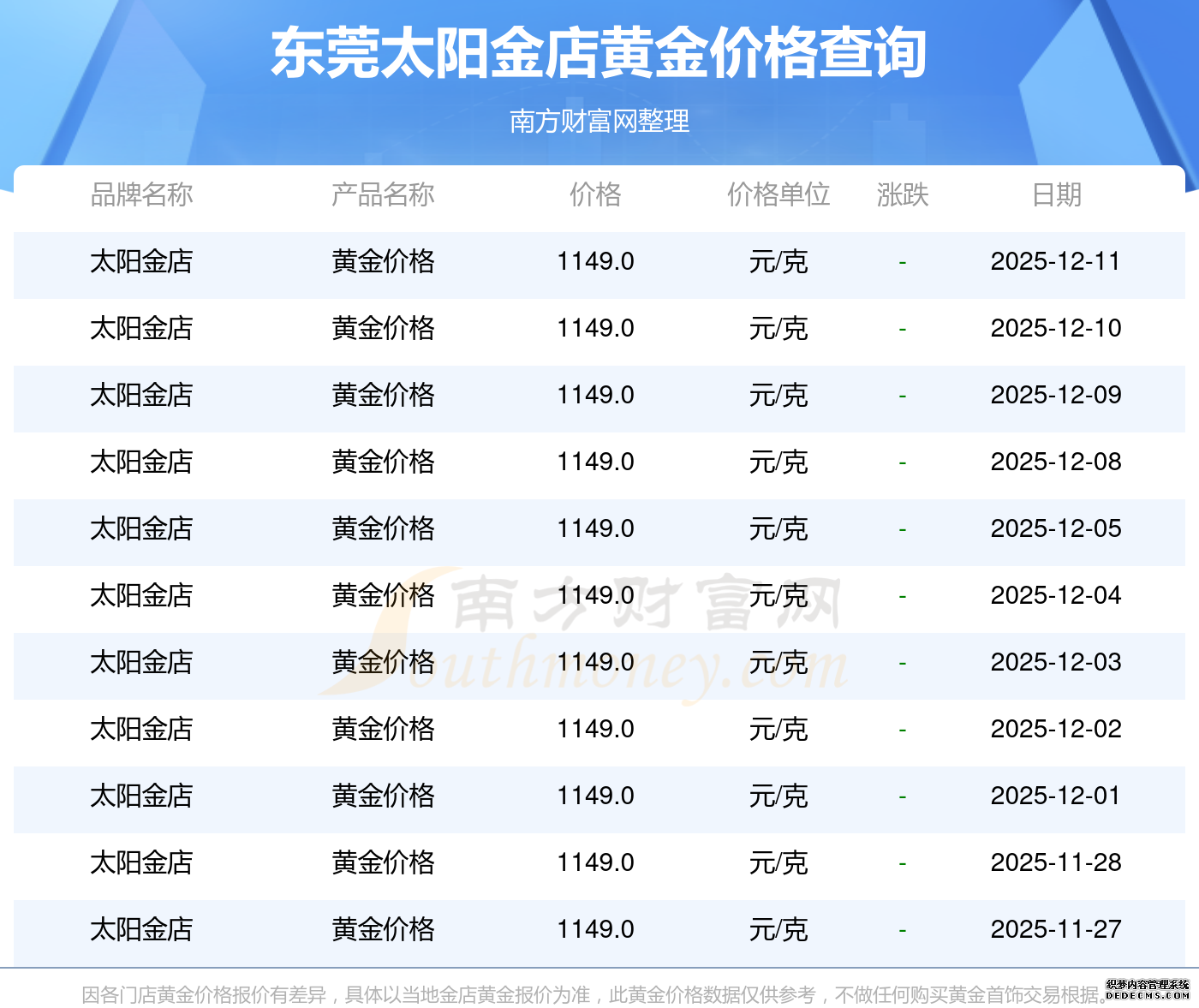 2025年12月11日,东莞太阳金店的黄金价值标价到达 1149.0元/克。