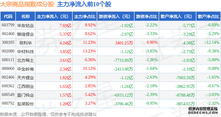 资金流向方面,大宗商品(000979)指数成份股当日主力资金净流入合计17.6亿元,逛资资金净流出合计7.74亿元,散户资金净流出合计9.86亿元。成份股资金流向详情睹下外: