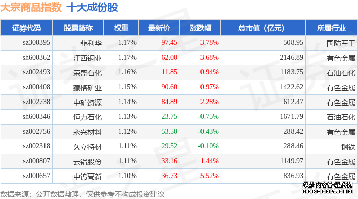 当日该指数成份股中—大宗商品分类证券之星音问,1月15日,大宗商品(000979)指数报收于7361.53点,涨0.85%,成交1789.22亿元,换手率1.34%。当日该指数成份股中,上涨的有62家,华友钴业以7.06%的涨幅领涨,下跌的有32家,东阳光以6.76%的跌幅领跌。