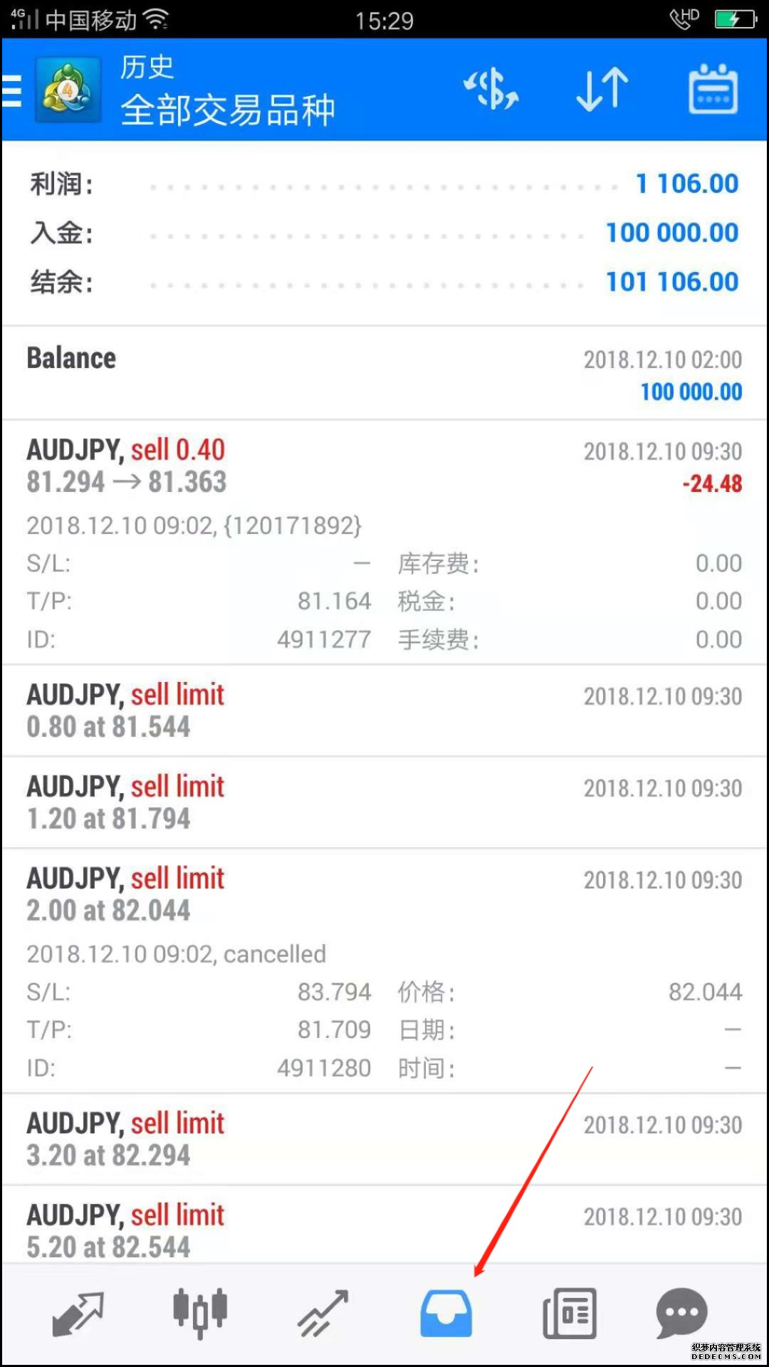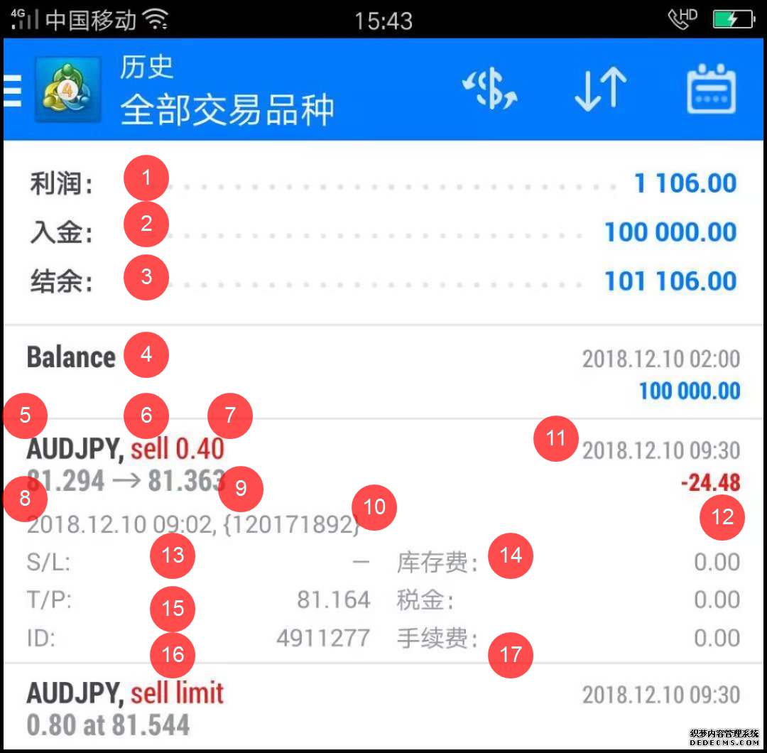 ⑥【GBPUSD】订单买卖泉币对种类。⑦【sell】指订单买卖类型(持仓/挂单)和众空偏向(buy/sell),buy - 众单,buy limit - 挂单做众,sell - 空单,sell limit - 挂单做空 。⑧【0.04】订单买卖手数的巨细。⑨【1.25735】指订单的修仓代价。⑩【1.25707】指持仓订单确当前代价,以及挂单订单眼前可预设的修仓代价。⑪【1.12】指持仓订单眼前的浮动盈亏。⑫【2018.12.11 02:31】修仓年光,指创修订单的年光。⑬【 120138525 】订单解说,以120发端举动解说的订单, 即为Fa机械人所做订单。⑭【S/L】止损代价,指订单所修立的止损代价。⑮【库存费】隔夜利钱或住宿费,正数为得到,负数为付出。⑯【T/P】止盈代价,指订单所修立的止盈代价。⑰【ID ]订单编号。⑱【手续费】修仓时买卖商收取的手续费,Ava Trade 爱华不收取手续费 。